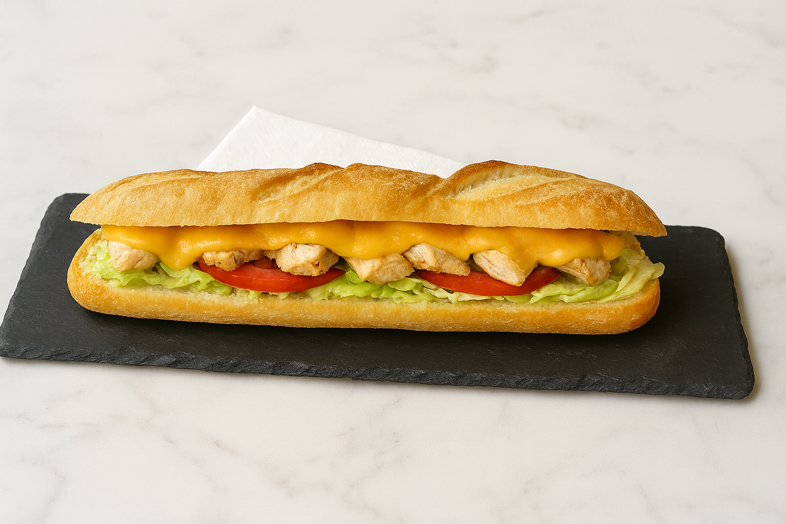 Une baguette croustillante, garni de poulet émincé légèrement fumé saveur BBQ, de confit d’oignons, salade, tomate et de fromage à raclette