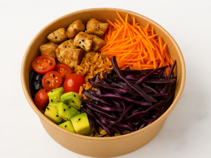 Boulgour, poulet, sauce teriyaki, avocat, chou rouge, carotte, oignon frit, sésame